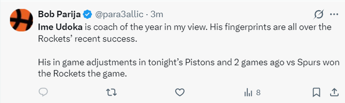 休媒对乌度卡的评价也是截然不同:在我看来乌度卡就是年度最佳主帅,火箭队近期的成就他贡献颇多,火箭击败活塞、马刺的比赛他做了很多战术调整。