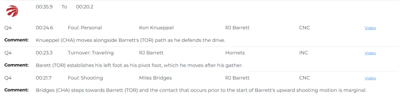 比赛最后23.3秒,裁判漏吹了RJ-巴雷特的走步违例,巴雷特将左脚作为中轴脚,但在合球后移动该脚。